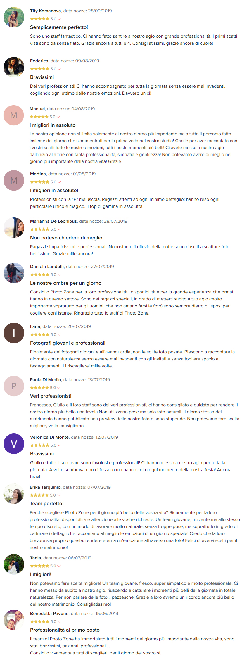 Le vostre opinioni sono importantissime per crescere, migliorarci e fare sempre meglio. Leggendo i pensieri che ci lasciano gli sposi potete entrare ancora di più nel merito del nostro lavoro comprendendo nel modo migliore come racconteremo il vostro matrimonio. Vi lasciamo qui alcune recensioni e se volete anche voi esprimere un’opinione su di noi e il lavoro svolto basta cliccare qui sotto. Grazie!